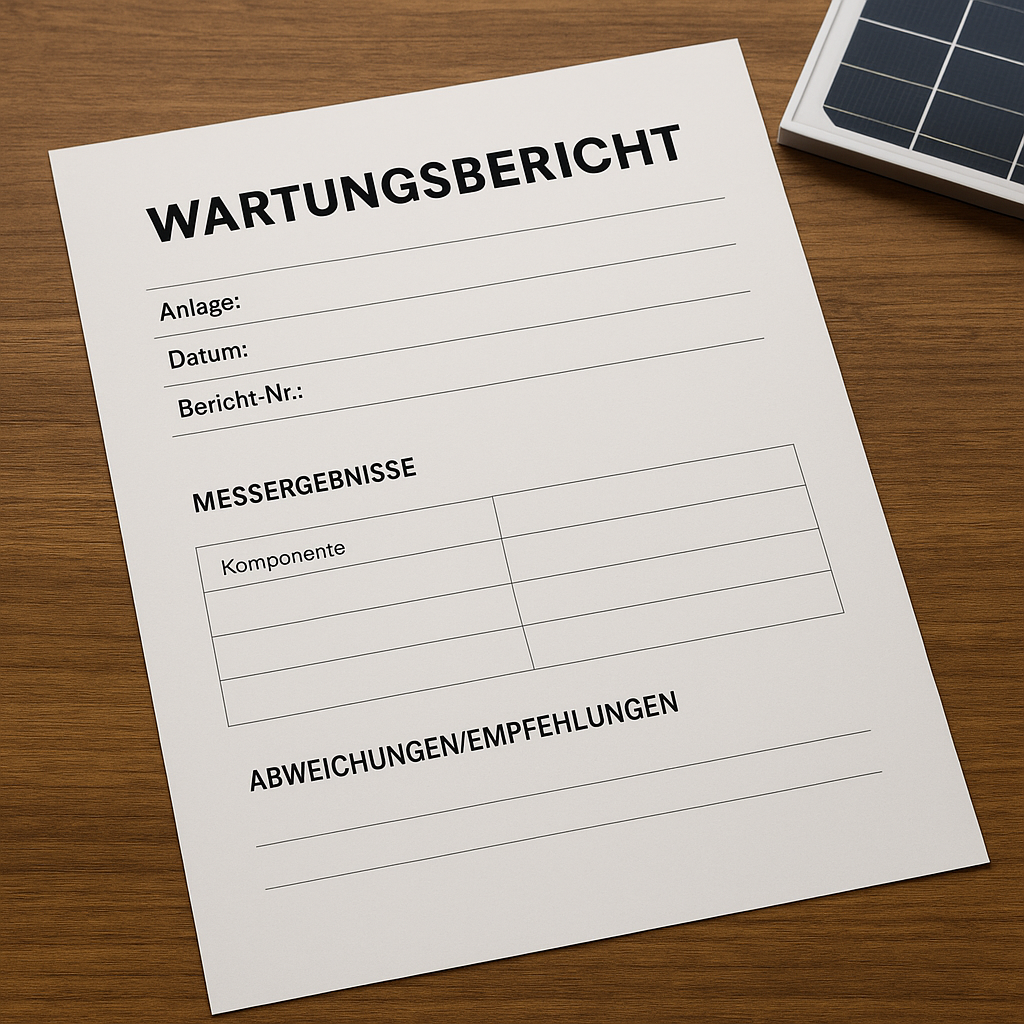 Nach jeder von uns durchgeführten Wartung erhalten Sie einen ausführlichen Wartungsbericht. Dieser Bericht dokumentiert den aktuellen Zustand Ihrer Photovoltaikanlage transparent und nachvollziehbar. Er enthält alle relevanten Messergebnisse sowie eine Übersicht der geprüften Komponenten.